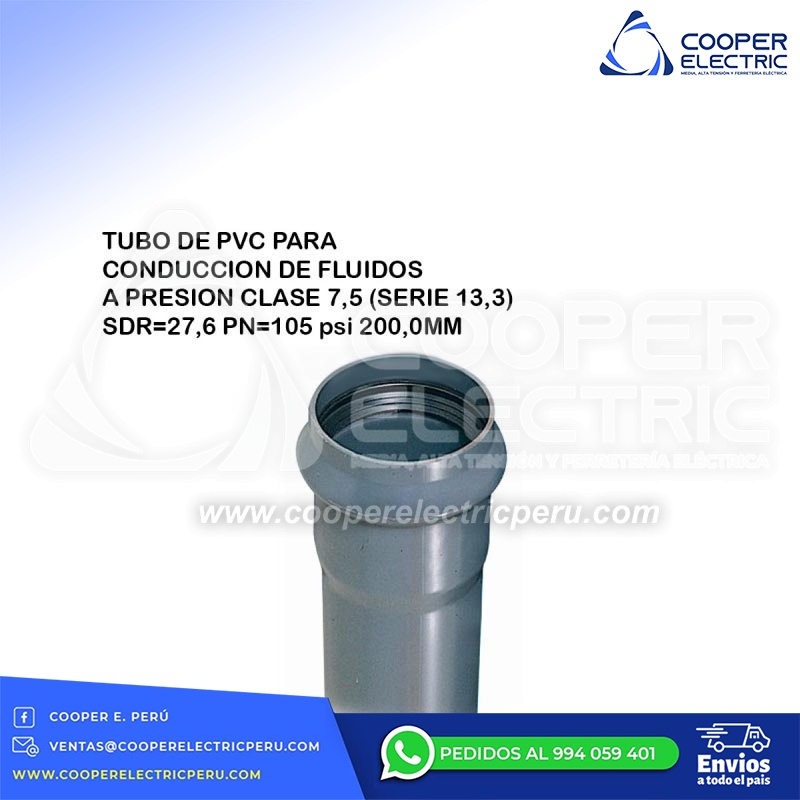 TUBO DE PVC PARA CONDUCCION DE FLUIDOS A PRESION CLASE 7,5 (SERIE 13,3) SDR=27,6 PN=105 psi 200,0MM KINPLAST